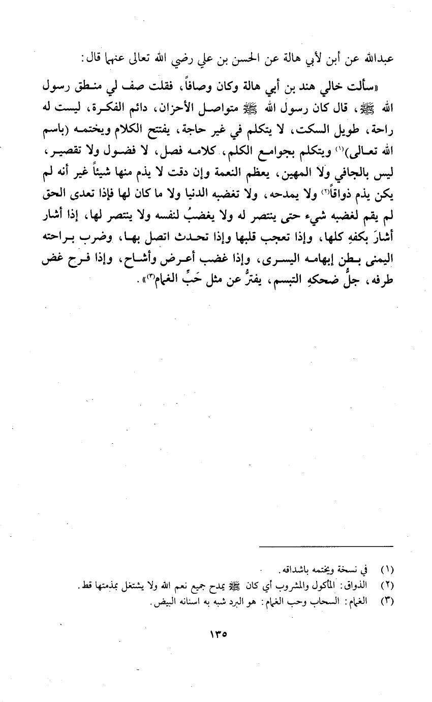«سألت خالي هند بن أبي هالة وكان وصافا، فقلت صف لي منطق رسول الله صلى الله عليه وسلم، قال كان رسول الله صلى الله عليه وسلم متواصل الأحزان، دائم الفكرة، ليست له راحة، طويل السكت، لا يتكلم في غير حاجة، يفتتح الكلام ويختمه (باسم الله تعالى) «1» ويتكلم بجوامع الكلم، كلامه فصل، لا فضول ولا تقصير، ليس بالجافي ولا المهين، يعظم النعمة وإن دقت لا يذم منها شيئا غير أنه لم يكن يذم ذواقا «2» ولا يمدحه، ولا تغضبه الدنيا ولا ما كان لها فإذا تعدى الحق لم يقم لغضبه شيء حتى ينتصر له ولا يغضب لنفسه ولا ينتصر لها، إذا أشار أشار بكفه كلها، وإذا تعجب قلبها وإذا تحدث اتصل بها، وضرب براحته اليمنى بطن إبهامه اليسرى، وإذا غضب أعرض وأشاح، وإذا فرح غض طرفه، جلّ ضحكه التبسم، يفترّ عن مثل حبّ الغمام «3» » .