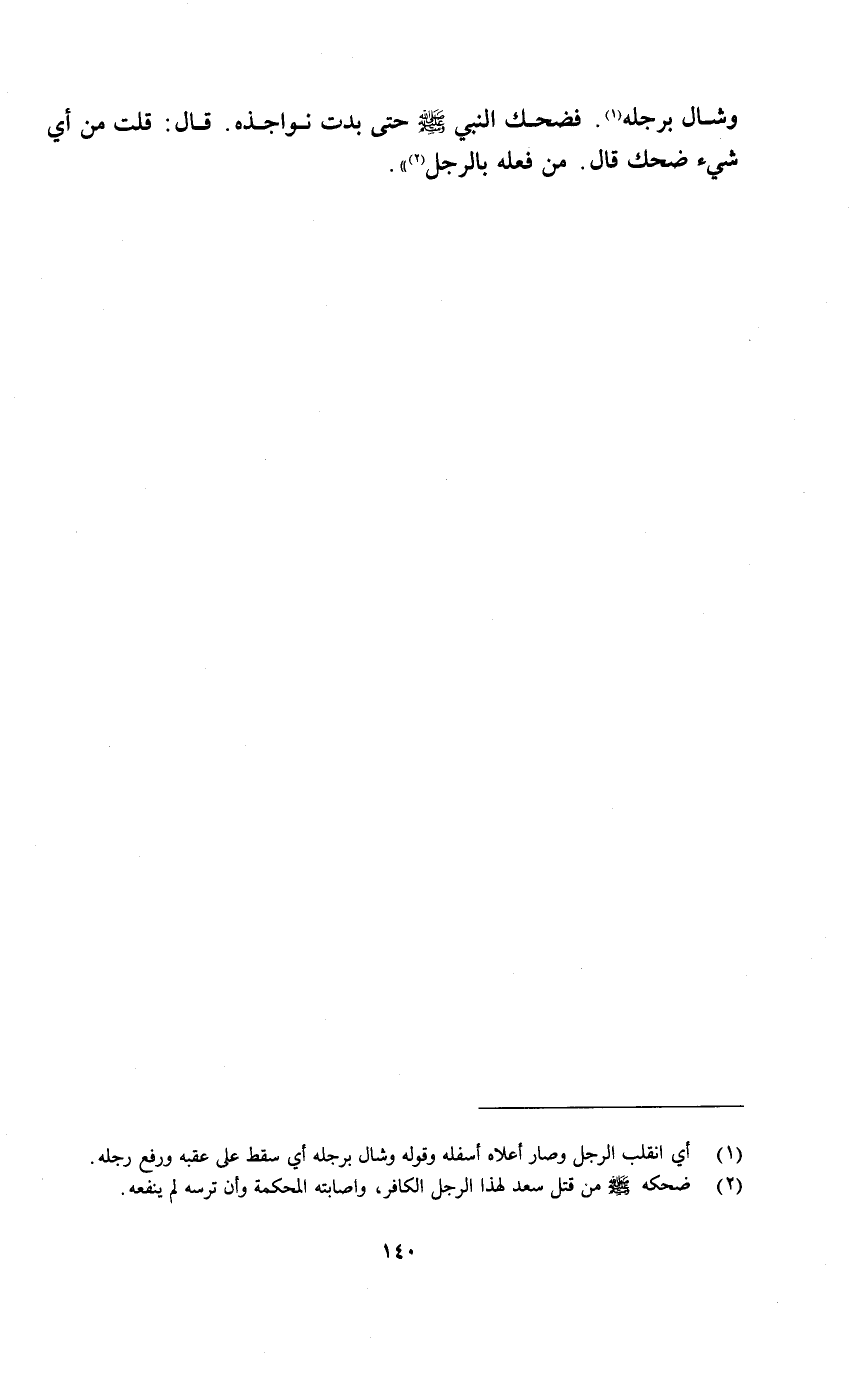 وشال برجله «1» . فضحك النبي صلى الله عليه وسلم حتى بدت نواجذه. قال: قلت من أي شيء ضحك قال. من فعله بالرجل «2» » .