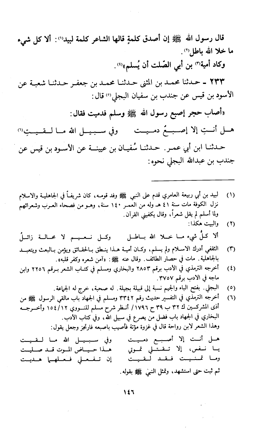 (6) أخرجه الترمذي في التفسير حديث رقم 3342 ومسلم في الجهاد باب مالقي الرسول صلى الله عليه وسلم من أذى المشركين ك 32 ب 39 ح 1796/ أنظر شرح مسلم للنووي 12/ 154 وأخرجه البخاري في الجهاد باب فضل من يصرع في سبيل الله، وفي كتاب الأدب. وهذا الشعر لابن رواحة قال في غزوة مؤتة فأصيب باصبعه فارتجز وجعل يقول: