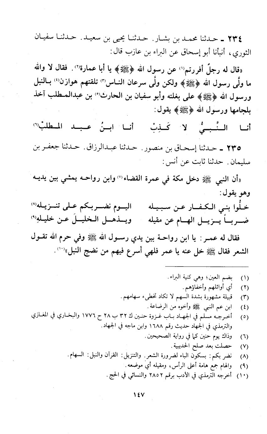 «قال له رجل أفررتم «1» عن رسول الله (صلى الله عليه وسلم) يا أبا عمارة «2» . فقال لا والله ما ولّى رسول الله (صلى الله عليه وسلم) ولكن ولّى سرعان الناس «3» تلقتهم هوازن «4» بالنبل ورسول الله (صلى الله عليه وسلم) على بغلته وأبو سفيان بن الحارث «5» بن عبد المطلب آخذ بلجامها ورسول الله (صلى الله عليه وسلم) يقول: