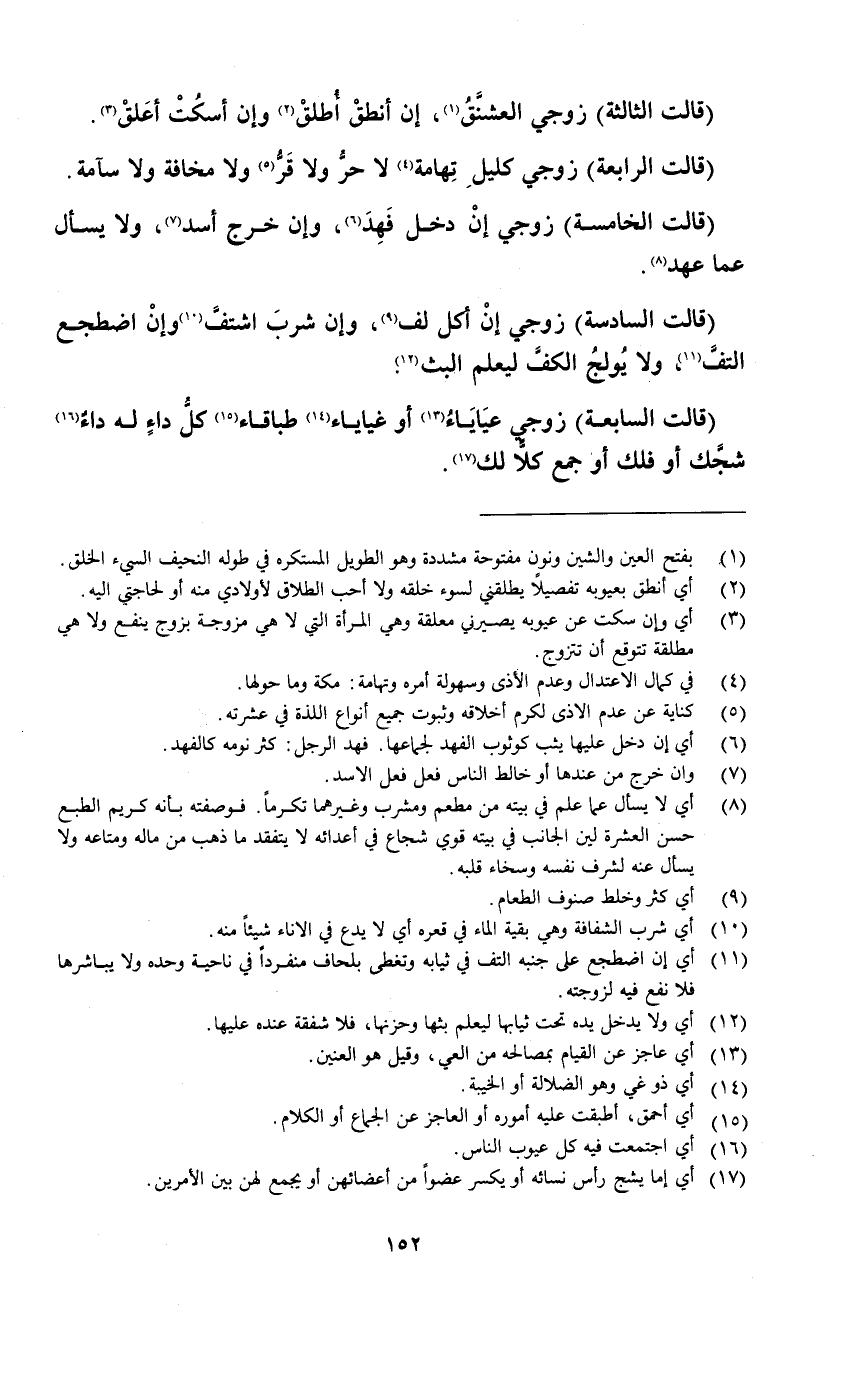 (قالت السادسة) زوجي إن أكل لف «9» ، وإن شرب اشتفّ «10» وإن اضطجع التفّ «11» ، ولا يولج الكفّ ليعلم البث «12» .
