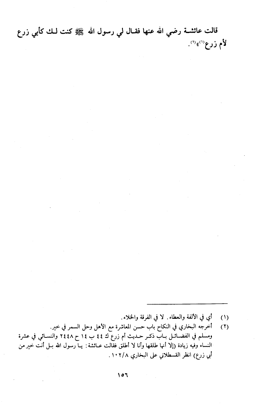 (2) أخرجه البخاري في النكاح باب حسن المعاشرة مع الأهل وحل السمر في خير. ومسلم في الفضائل باب ذكر حديث أم زرع ك 44 ب 14 ح 2448 والنسائي في عشرة النساء وفيه زيادة (إلا أنها طلقها وأنا لا أطلق فقالت عائشة: يا رسول الله بل أنت خير من أبي زرع) انظر القسطلاني على البخاري 8/ 102.