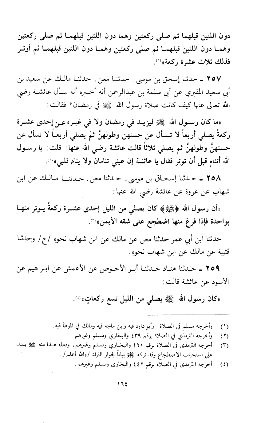 257- حدثنا إسحق بن موسى. حدثنا معن. حدثنا مالك عن سعيد بن أبي سعيد المقبري عن أبي سلمة بن عبد الرحمن أنه أخبره أنه سأل عائشة رضي الله تعالى عنها كيف كانت صلاة رسول الله صلى الله عليه وسلم في رمضان؟ فقالت: