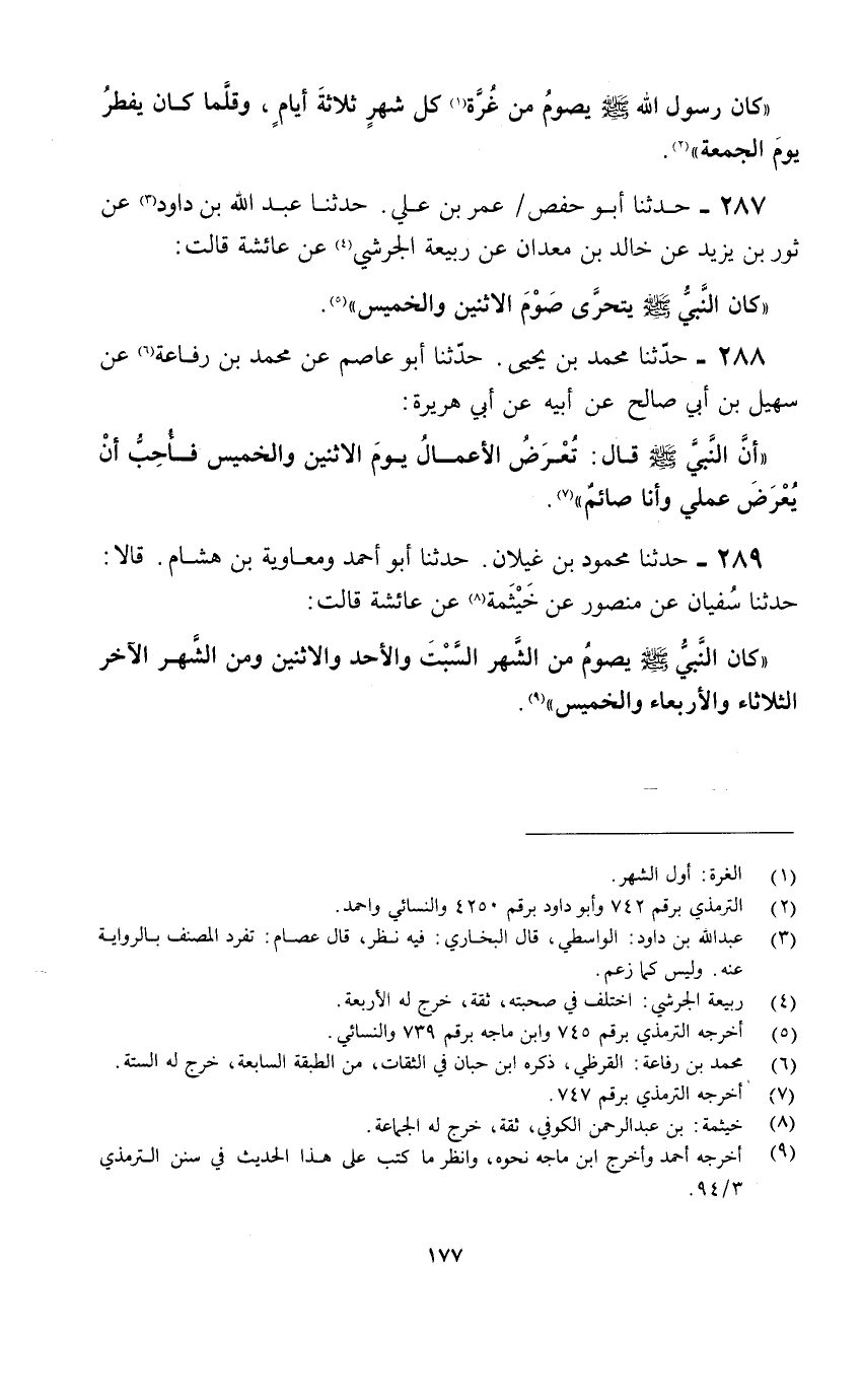 «كان النّبيّ صلى الله عليه وسلم يصوم من الشّهر السّبت والأحد والاثنين ومن الشّهر الآخر الثلاثاء والأربعاء والخميس» «9» .