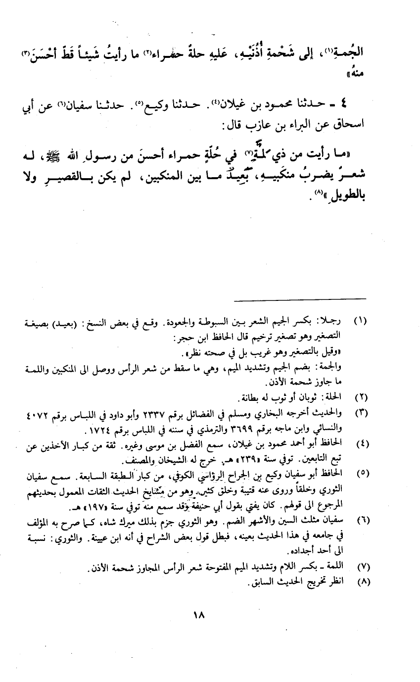(1) رجلا: بكسر الجيم الشعر بين السبوطة والجعودة. وقع في بعض النسخ: (بعيد) بصيغة التصغير وهو تصغير ترخيم قال الحافظ ابن حجر: «وقيل بالتصغير وهو غريب بل في صحته نظر» . والجمة: بضم الجيم وتشديد الميم، وهي ما سقط من شعر الرأس ووصل الى المنكبين واللمة ما جاوز شحمة الأذن.