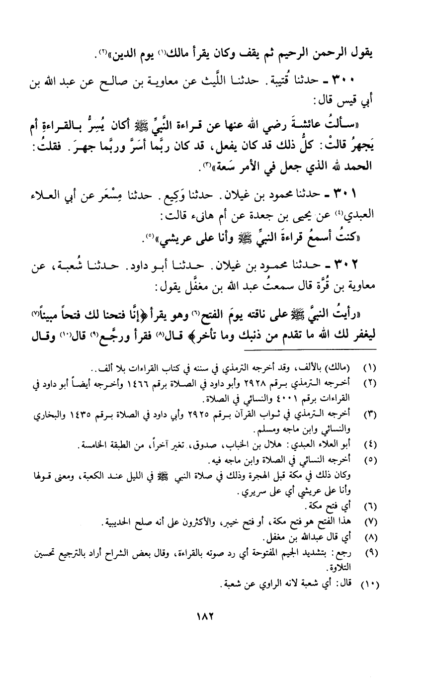 «رأيت النبيّ صلى الله عليه وسلم على ناقته يوم الفتح «6» وهو يقرأ إِنَّا فَتَحْنا لَكَ فَتْحاً مُبِيناً «7» لِيَغْفِرَ لَكَ اللَّهُ ما تَقَدَّمَ مِنْ ذَنْبِكَ وَما تَأَخَّرَ قال «8» فقرأ ورجّع «9» قال «10» وقال