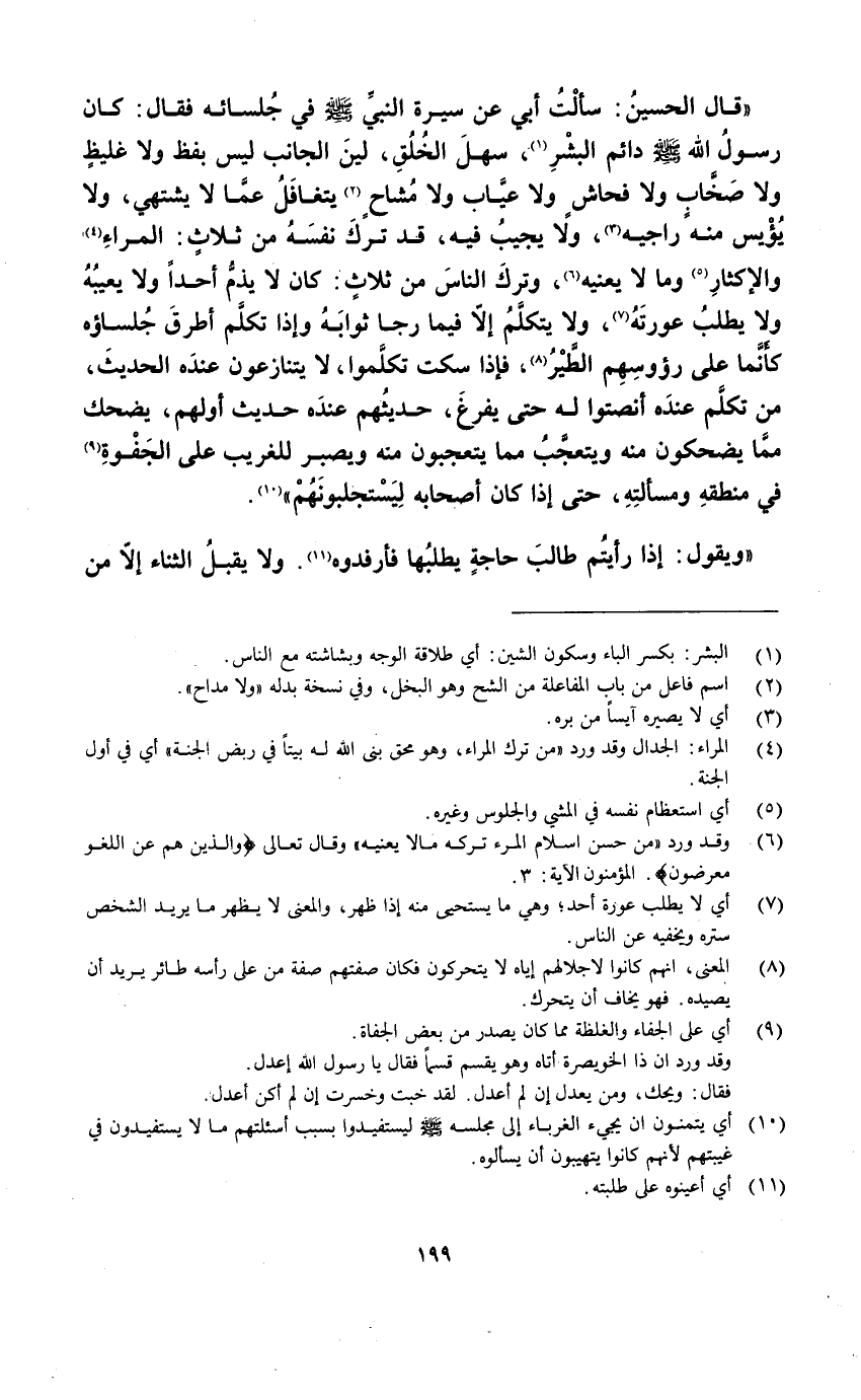 «قال الحسين: سألت أبي عن سيرة النبيّ صلى الله عليه وسلم في جلسائه فقال: كان رسول الله صلى الله عليه وسلم دائم البشر «1» ، سهل الخلق، لين الجانب ليس بفظ ولا غليظ ولا صخّاب ولا فحاش ولا عيّاب ولا مشاح «2» يتغافل عمّا لا يشتهي، ولا يؤيس منه راجيه «3» ، ولا يجيب فيه، قد ترك نفسه من ثلاث: المراء «4» والإكثار «5» وما لا يعنيه «6» ، وترك الناس من ثلاث: كان لا يذمّ أحدا ولا يعيبه ولا يطلب عورته «7» ، ولا يتكلّم إلّا فيما رجا ثوابه وإذا تكلّم أطرق جلساؤه كأنّما على رؤوسهم الطّير «8» ، فإذا سكت تكلّموا، لا يتنازعون عنده الحديث، من تكلّم عنده أنصتوا له حتى يفرغ، حديثهم عنده حديث أولهم، يضحك ممّا يضحكون منه ويتعجّب مما يتعجبون منه ويصبر للغريب على الجفوة «9» في منطقة ومسألته، حتى إذا كان أصحابه ليستجلبونهم» «10» .