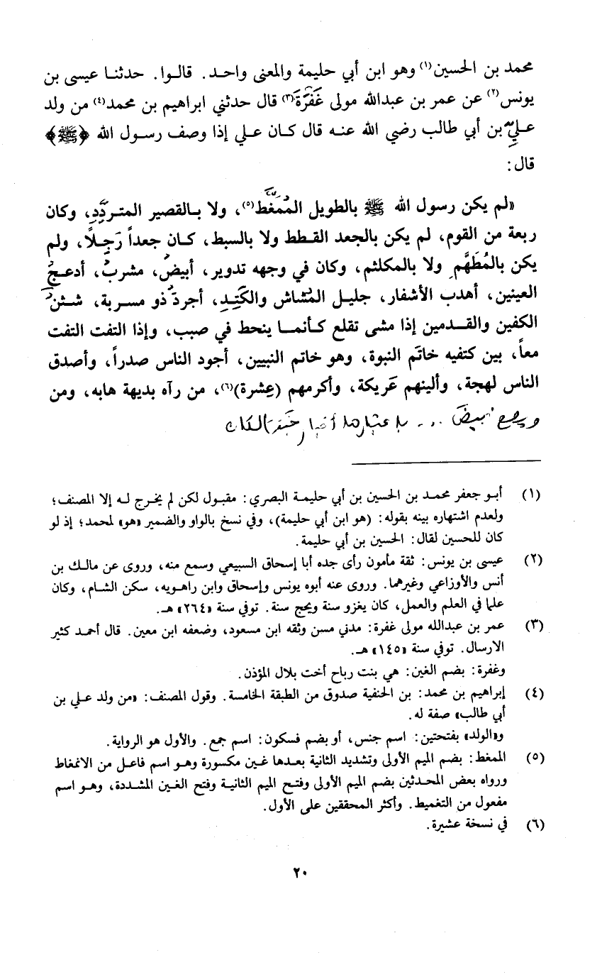 محمد بن الحسين «1» وهو ابن أبي حليمة والمعنى واحد. قالوا. حدثنا عيسى بن يونس «2» عن عمر بن عبد الله مولى غفرة «3» قال حدثني ابراهيم بن محمد «4» من ولد علي بن أبي طالب رضي الله عنه قال كان علي إذا وصف رسول الله (صلى الله عليه وسلم) قال: