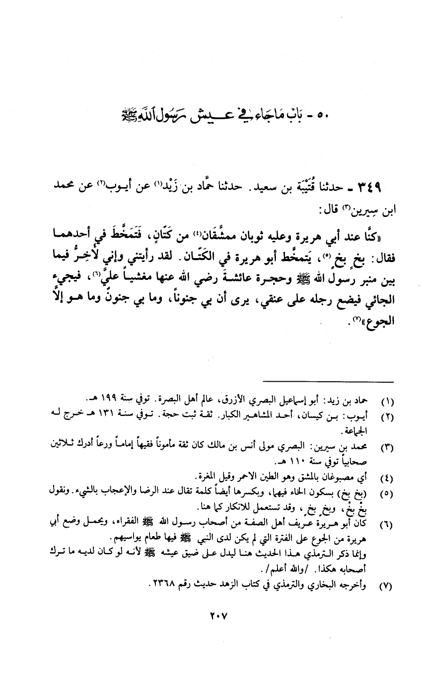 (6) كان أبو هريرة عريف أهل الصفة من أصحاب رسول الله صلى الله عليه وسلم الفقراء، ويحمل وضع أبي هريرة من الجوع على الفترة التي لم يكن لدى النبي صلى الله عليه وسلم فيها طعام يواسيهم. وإنما ذكر الترمذي هذا الحديث هنا ليدل على ضيق عيشه صلى الله عليه وسلم لأنه لو كان لديه ما ترك أصحابه هكذا. / والله أعلم/.