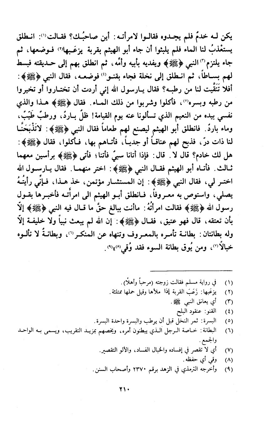 هل لك خادم؟ قال لا. قال: فإذا أتانا سبي فأتنا؛ فأتى (صلى الله عليه وسلم) برأسين معهما ثالث. فأتاه أبو الهيثم فقال النبي (صلى الله عليه وسلم) : اختر منهما. فقال يا رسول الله اختر لي، فقال النبي (صلى الله عليه وسلم) : إن المستشار مؤتمن، خذ هذا، فإنّي رأيته يصلي، واستوص به معروفا، فانطلق أبو الهيثم الى امرأته فأخبرها بقول رسول الله (صلى الله عليه وسلم) فقالت امرأته: ما أنت ببالغ حقّ ما قال فيه النبي (صلى الله عليه وسلم) إلّا بأن تعتقه، قال فهو عتيق، فقال (صلى الله عليه وسلم) : إن الله لم يبعث نبيا ولا خليفة إلّا وله بطانتان: بطانة تأمره بالمعروف وتنهاه عن المنكر «6» ، وبطانة لا تألوه خبالا «7» ، ومن يوق بطانة السوء فقد وقي «8» » «9» .