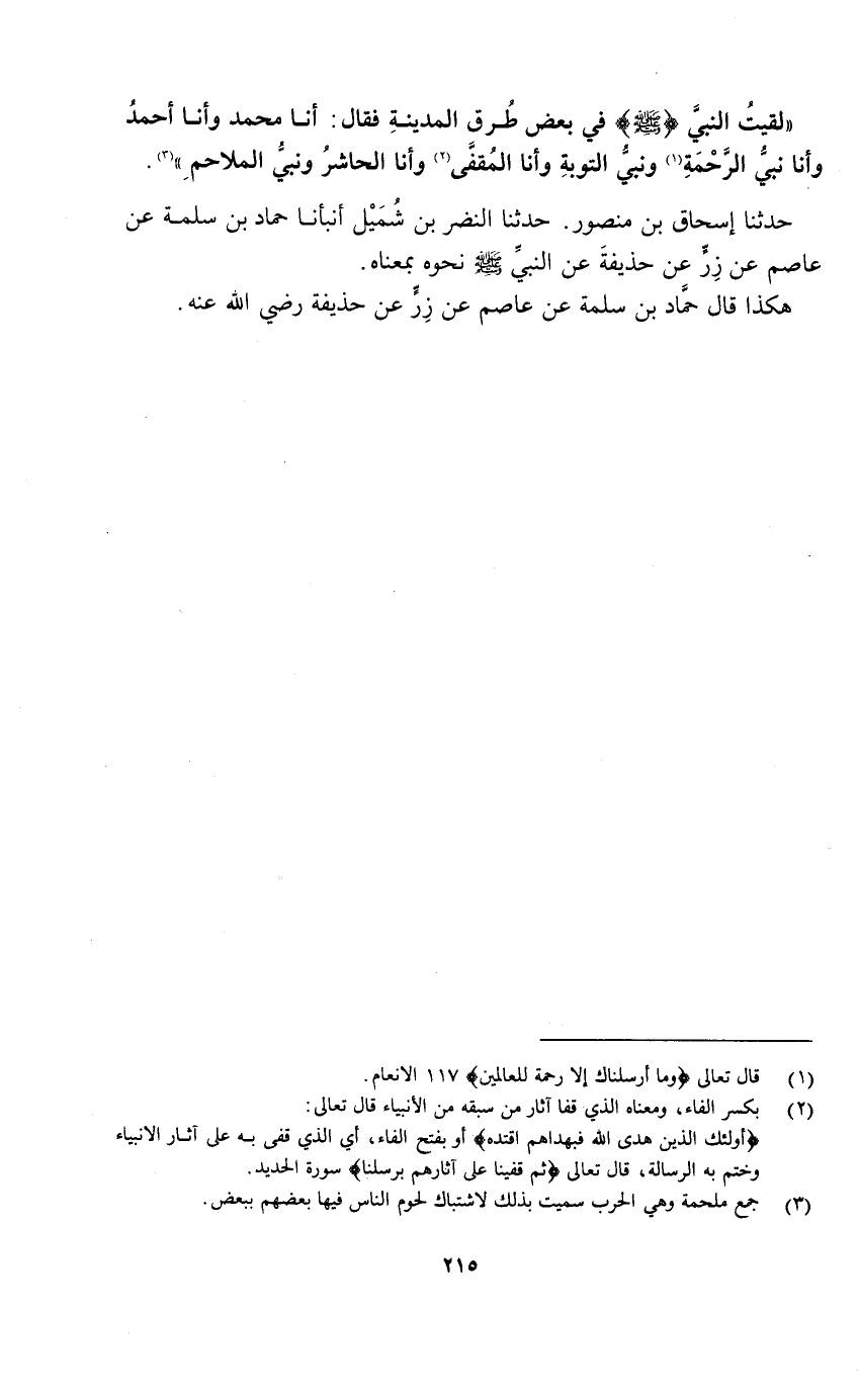 «لقيت النبيّ (صلى الله عليه وسلم) في بعض طرق المدينة فقال: أنا محمد وأنا أحمد وأنا نبيّ الرّحمة «1» ونبيّ التوبة وأنا المقفّى «2» وأنا الحاشر ونبيّ الملاحم» «3» .