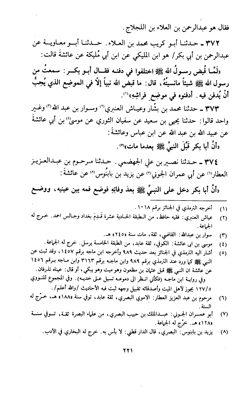 374- حدثنا نصير بن علي الجهضمي. حدثنا مرحوم بن عبد العزيز العطار «6» عن أبي عمران الجوني «7» عن يزيد بن بابنوس «8» عن عائشة:
