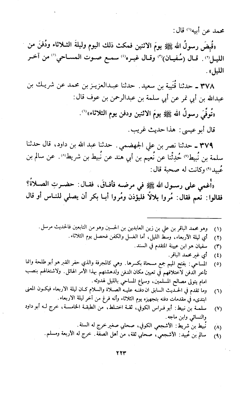 379- حدثنا نصر بن علي الجهضمي. حدثنا عبد الله بن داود، قال حدثنا سلمة بن نبيط «7» حدثنا عن نعيم بن أبي هند عن نبيط بن شريط «8» . عن سالم بن عبيد «9» وكانت له صحبة قال: