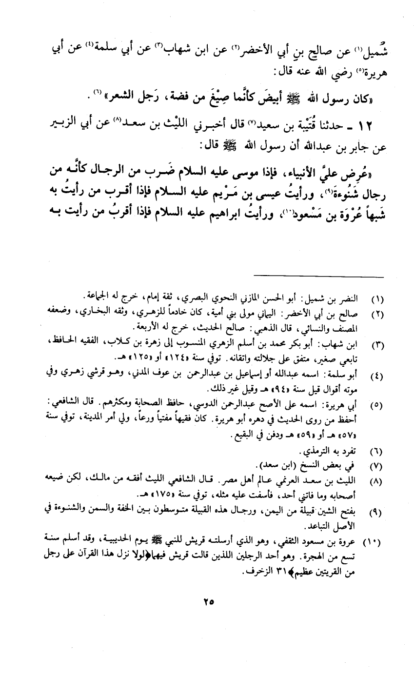 (3) ابن شهاب: أبو بكر محمد بن أسلم الزهري المنسوب إلى زهرة بن كلاب، الفقيه الحافظ، تابعي صغير، متفق على جلالته واتقانه. توفي سنة «124» أو «125» هـ.