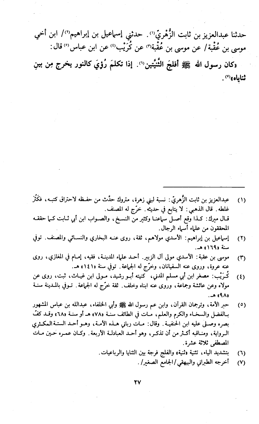 حدثنا عبد العزيز بن ثابت الزّهريّ «1» . حدثني إسماعيل بن إبراهيم «2» / ابن أخي موسى بن عقبة/ عن موسى بن عقبة «3» عن كريب «4» عن ابن عباس «5» قال: