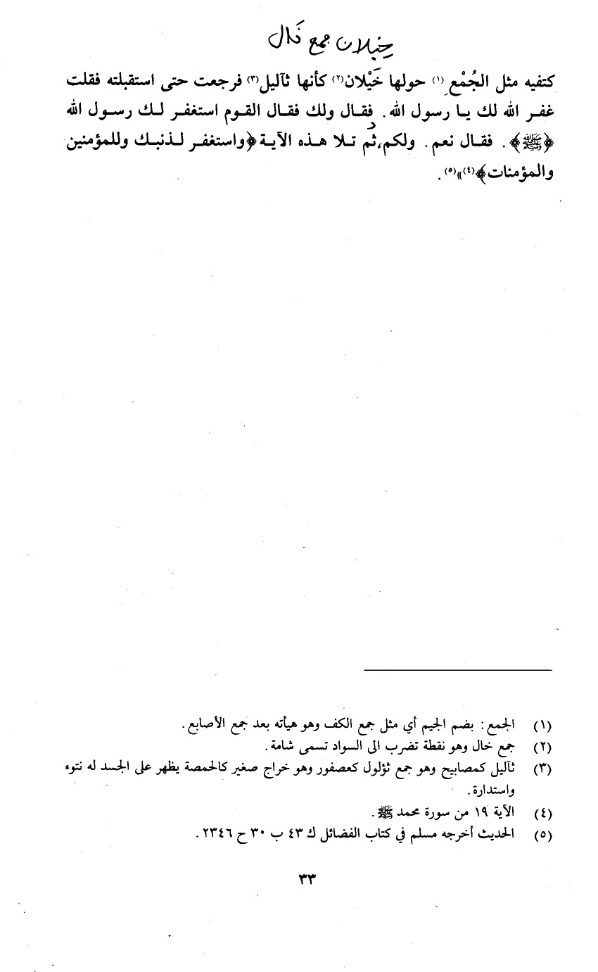 كتفيه مثل الجمع «1» حولها خيلان «2» كأنها ثآليل «3» فرجعت حتى استقبلته فقلت غفر الله لك يا رسول الله. فقال ولك فقال القوم استغفر لك رسول الله (صلى الله عليه وسلم) . فقال نعم. ولكم ثم تلا هذه الآية وَاسْتَغْفِرْ لِذَنْبِكَ وَلِلْمُؤْمِنِينَ وَالْمُؤْمِناتِ «4» » «5» .