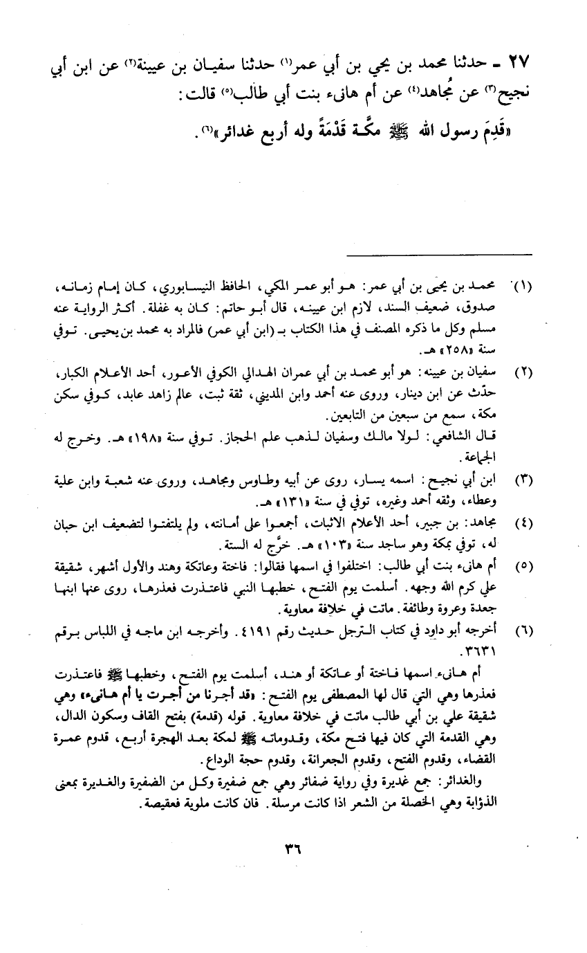 27- حدثنا محمد بن يحي بن أبي عمر «1» حدثنا سفيان بن عيينة «2» عن ابن أبي نجيح «3» عن مجاهد «4» عن أم هانىء بنت أبي طالب «5» قالت: