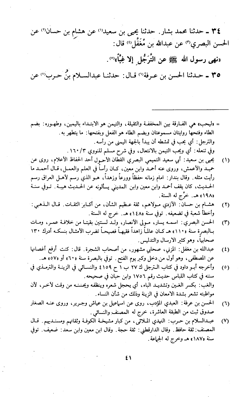 (5) وأخرجه أبو داود في كتاب الترجل ك 27 ب 1 ح 4159 والنسائي في الزينة والترمذي في سننه في كتاب اللباس حديث رقم 1756 وابن حبان في صحيحه. والغب: بكسر الغين وتشديد الباء، أي يحجل شعره وينظفه ويحسنه من وقت لآخر، لأن مواظبته تشعر بشدة الامعان في الزينة وذلك من شأن النساء.