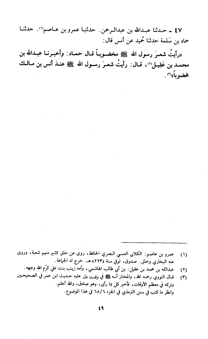 «رأيت شعر رسول الله صلى الله عليه وسلم مخضوبا قال حماد: وأخبرنا عبد الله بن محمد بن عقيل «2» ، قال: رأيت شعر رسول الله صلى الله عليه وسلم عند أنس بن مالك مخضوبا» «3» .