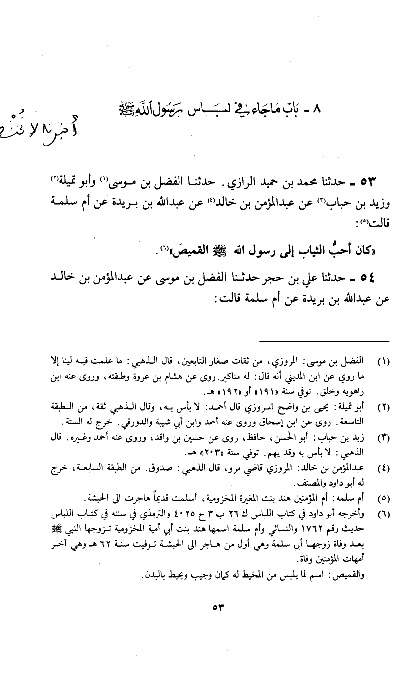 53- حدثنا محمد بن حميد الرازي. حدثنا الفضل بن موسى «1» وأبو تميلة «2» وزيد بن حباب «3» عن عبد المؤمن بن خالد «4» عن عبد الله بن بريدة عن أم سلمة قالت «5» :