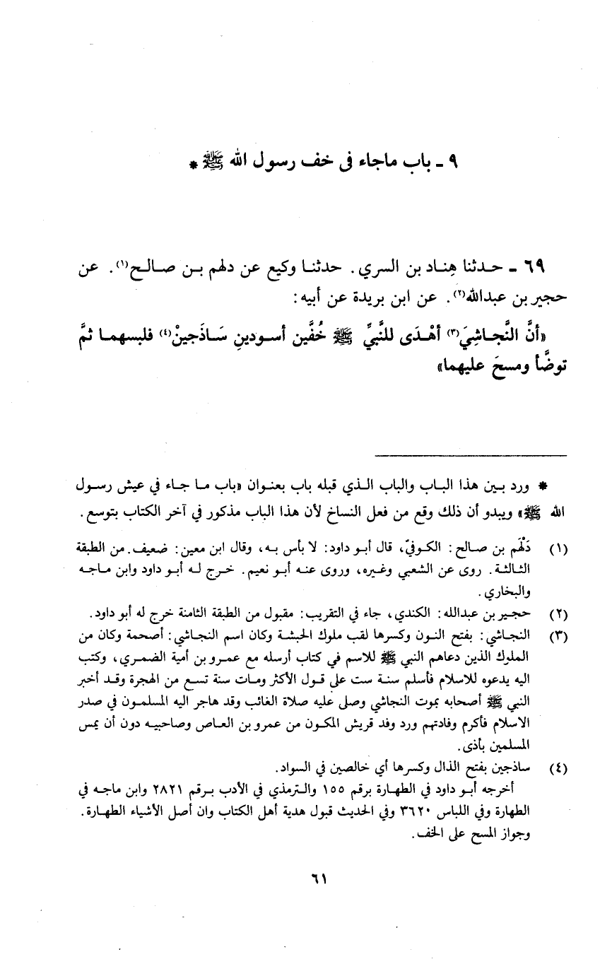 (4) ساذجين بفتح الذال وكسرها أي خالصين في السواد. أخرجه أبو داود في الطهارة برقم 155 والترمذي في الأدب برقم 2821 وابن ماجه في الطهارة وفي اللباس 3620 وفي الحديث قبول هدية أهل الكتاب وان أصل الأشياء الطهارة. وجواز المسح على الخف.