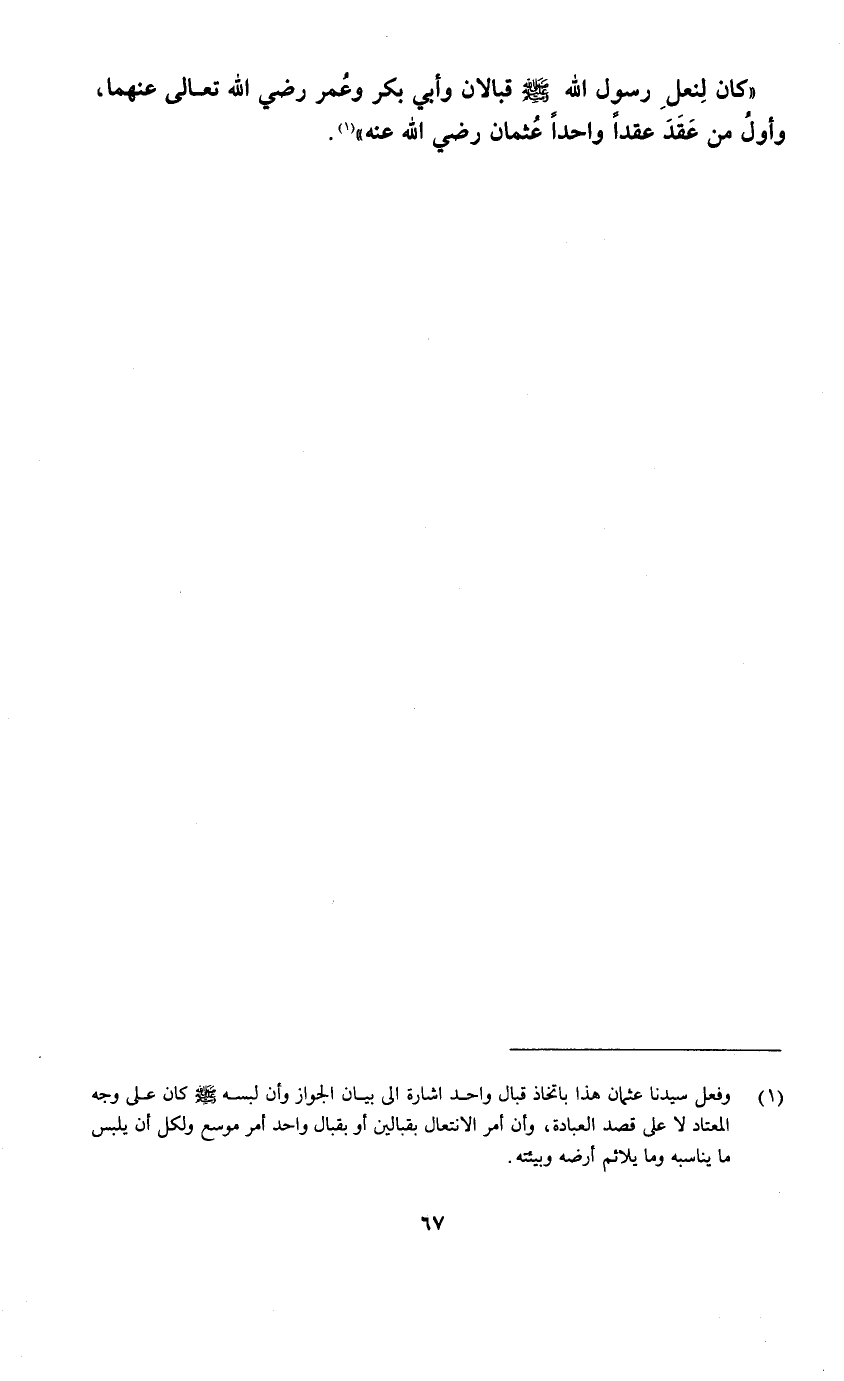 (1) وفعل سيدنا عثمان هذا باتخاذ قبال واحد اشارة الى بيان الجواز وأن لبسه صلى الله عليه وسلم كان على وجه المعتاد لا على قصد العبادة، وأن أمر الانتعال بقبالين أو بقبال واحد أمر موسع ولكل أن يلبس ما يناسبه وما يلائم أرضه وبيئته.