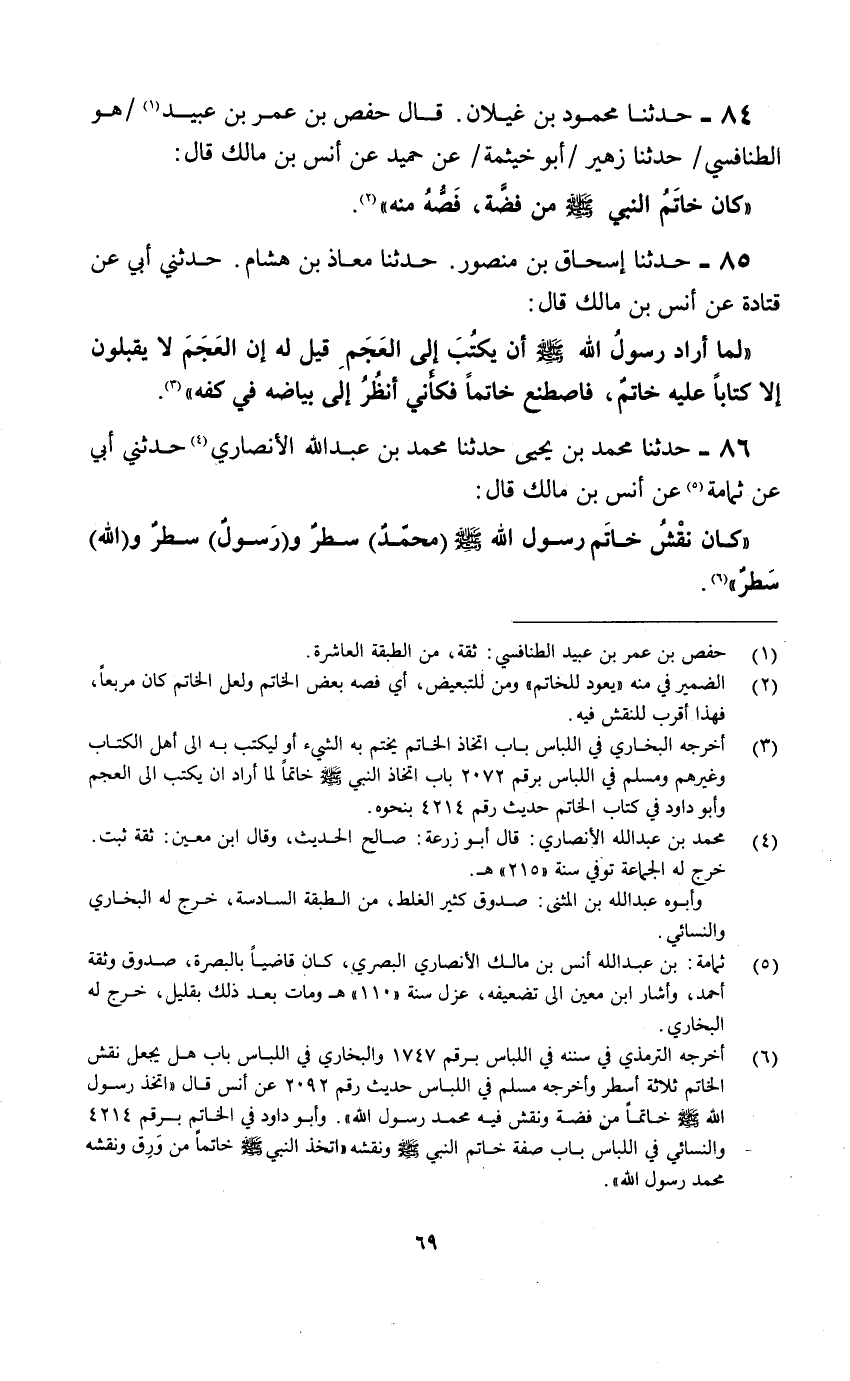 (6) أخرجه الترمذي في سننه في اللباس برقم 1747 والبخاري في اللباس باب هل يجعل نقش الخاتم ثلاثة أسطر وأخرجه مسلم في اللباس حديث رقم 2092 عن أنس قال «اتخذ رسول الله صلى الله عليه وسلم خاتما من فضة ونقش فيه محمد رسول الله» . وأبو داود في الخاتم برقم 4214 والنسائي في اللباس باب صفة خاتم النبي صلى الله عليه وسلم ونقشه «اتخذ النبي صلى الله عليه وسلم خاتما من ورق ونقشه محمد رسول الله» .