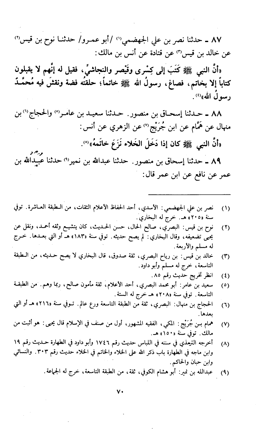 (6) الحجاج بن منهال: البصري، ثقة من الطبقة التاسعة ورع عالم. توفي سنة «216» هـ أو التي بعدها.