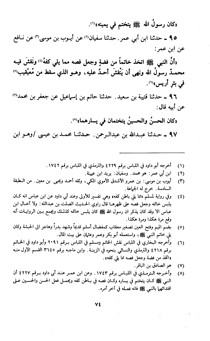 (4) وفي رواية لمسلم «مما يلي باطن كفه» وهي تفسير للأولى وعند أبي داود عن ابن عباس انه كان يلبس خاتمه وجعل فصه على ظهرها قال راوي الحديث الصلت بن عبد الله: ولا أخال ابن عباس الا وقد كان يذكر ان رسول الله صلى الله عليه وسلم كان يلبس خاتمه كذلك ويجمع بين الروايات أنه وقع مرة هكذا ومرة هكذا.
