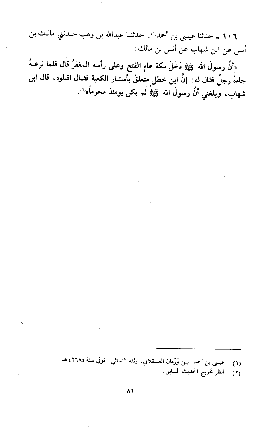 106- حدثنا عيسى بن أحمد «1» . حدثنا عبد الله بن وهب حدثني مالك بن أنس عن ابن شهاب عن أنس بن مالك: