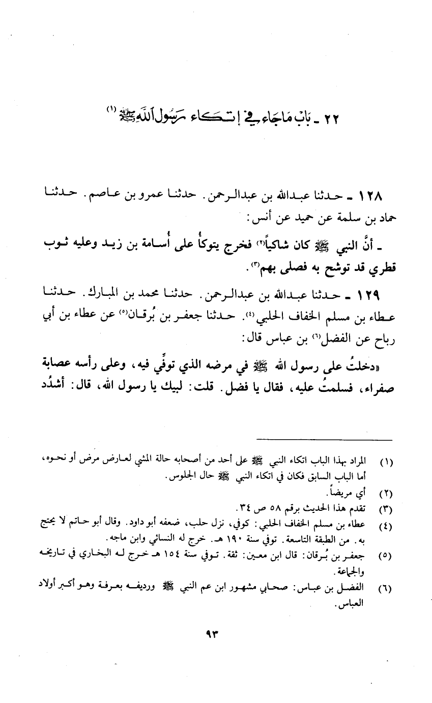 (1) المراد بهذا الباب اتكاء النبي صلى الله عليه وسلم على أحد من أصحابه حالة المشي لعارض مرض أو نحوه، أما الباب السابق فكان في اتكاء النبي صلى الله عليه وسلم حال الجلوس.