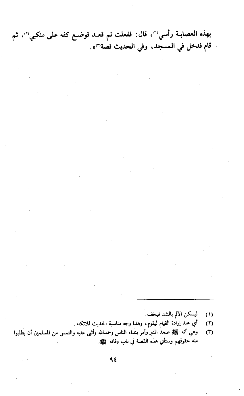 بهذه العصابة رأسي «1» ، قال: ففعلت ثم قعد فوضع كفه على منكبي «2» ، ثم قام فدخل في المسجد، وفي الحديث قصة «3» » .