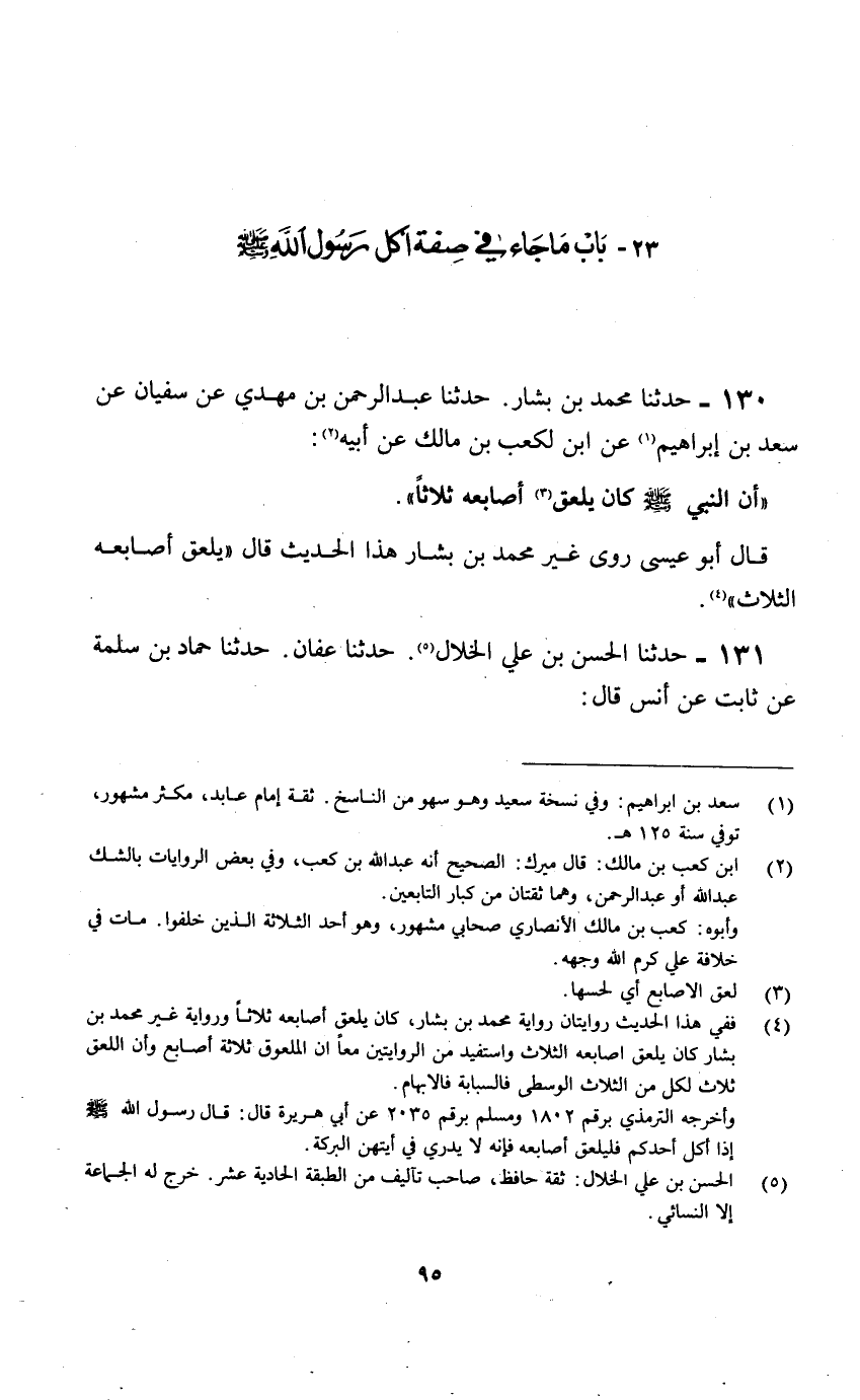 (4) ففي هذا الحديث روايتان رواية محمد بن بشار، كان يلعق أصابعه ثلاثا ورواية غير محمد بن بشار كان يلعق اصابعه الثلاث واستفيد من الروايتين معا ان الملعوق ثلاثة أصابع وأن اللعق ثلاث لكل من الثلاث الوسطى فالسبابة فالابهام. وأخرجه الترمذي برقم 1802 ومسلم برقم 2035 عن أبي هريرة قال: قال رسول الله صلى الله عليه وسلم إذا أكل أحدكم فليلعق أصابعه فإنه لا يدري في أيتهن البركة.