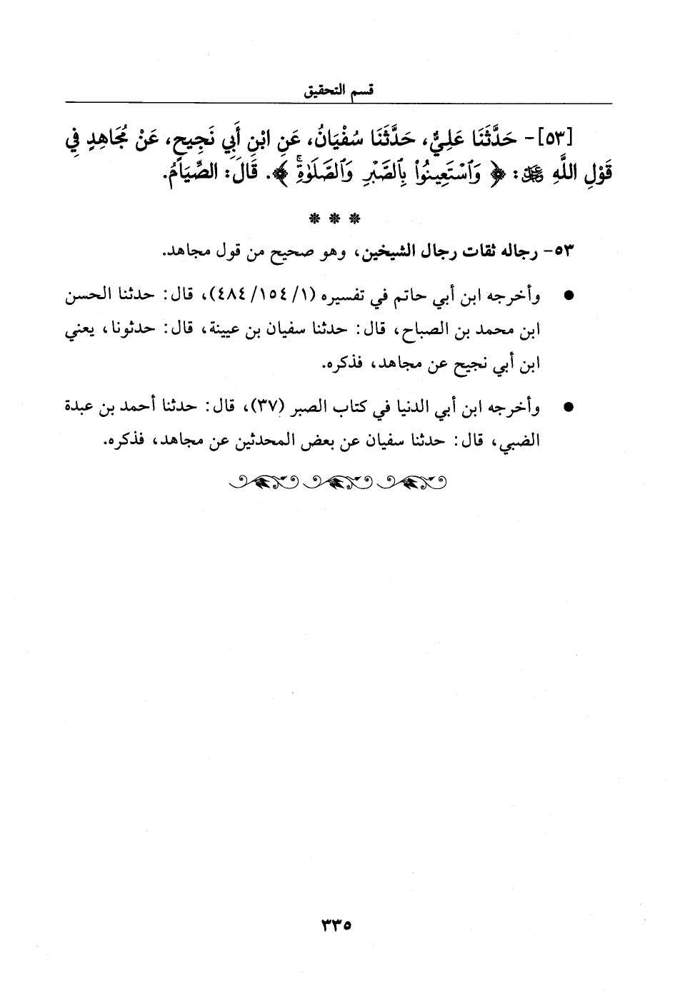 53 - حدثنا علي، حدثنا سفيان، عن ابن أبي نجيح، عن مجاهد في قول الله عز وجل: {واستعينوا بالصبر والصلاة}. قال: الصيام.
