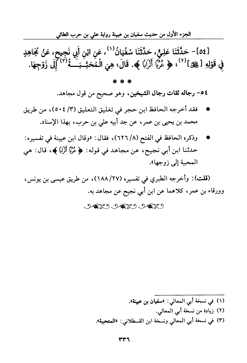 54 - حدثنا علي، حدثنا سفيان، عن ابن أبي نجيح، عن مجاهد في قوله [عز وجل]: {عربا أترابا}. قال: هي المحببة إلى زوجها.