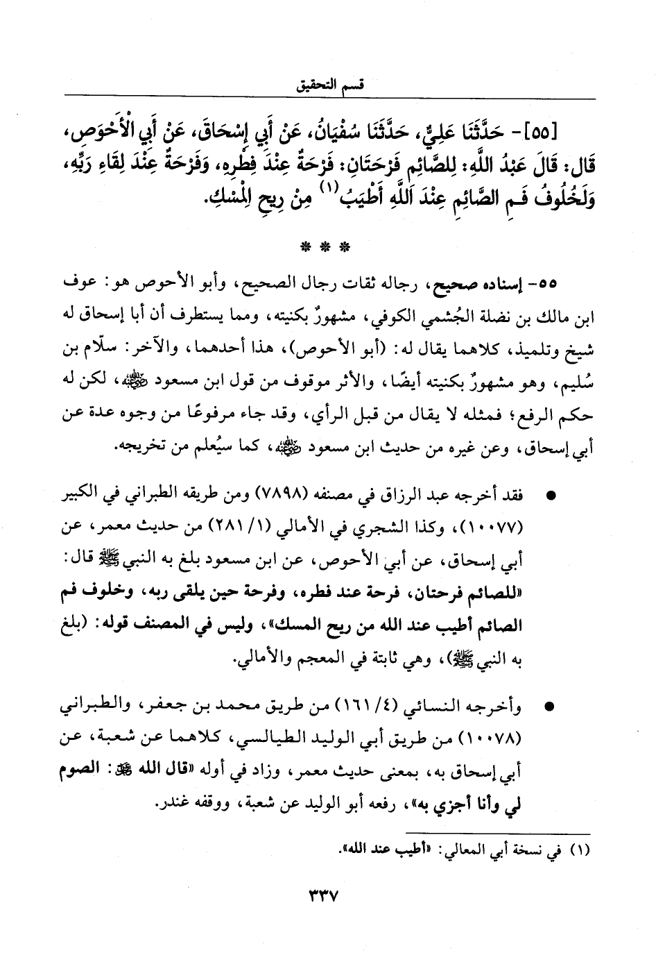 55 - حدثنا علي، حدثنا سفيان، عن أبي إسحاق، عن أبي الأحوص، قال: قال عبد الله: للصائم فرحتان: فرحة عند فطره، وفرحة عند لقاء ربه، ولخلوف فم الصائم عند الله أطيب من ريح المسك.