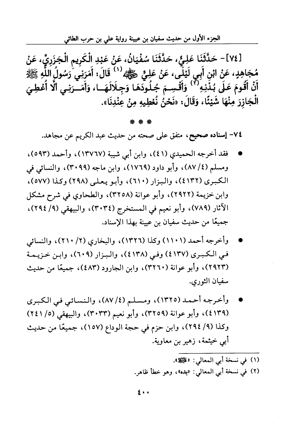 74 - حدثنا علي، حدثنا سفيان، عن عبد الكريم الجزري، عن مجاهد، عن ابن أبي ليلى، عن علي رضي الله عنه قال: أمرني رسول الله صلى الله عليه وسلم أن أقوم على بدنه وأقسم جلودها وجلالها، وأمرني ألا أعطي الجازر منها شيئا، وقال: ((نحن نعطيه من عندنا)).
