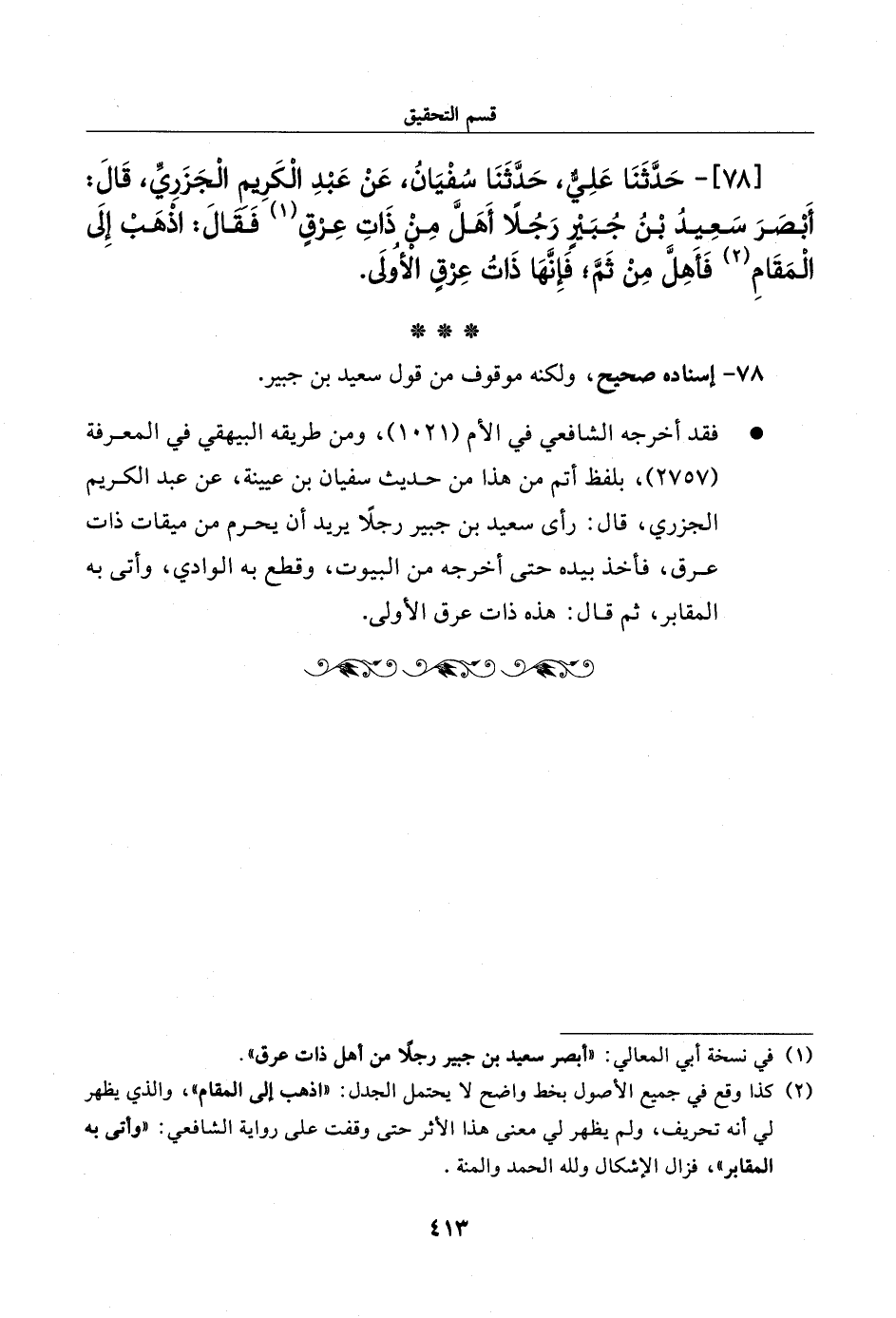 78 - حدثنا علي، حدثنا سفيان، عن عبد الكريم الجزري، قال: أبصر سعيد بن جبير رجلا أهل من ذات عرق فقال: اذهب إلى المقام فأهل من ثم؛ فإنها ذات عرق الأولى.