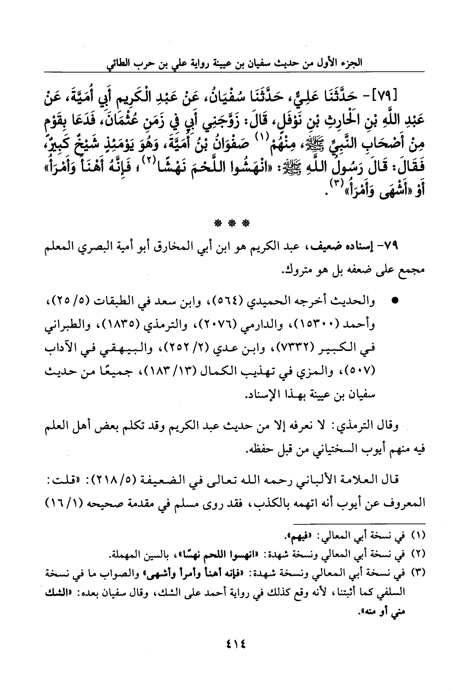 79 - حدثنا علي، حدثنا سفيان، عن عبد الكريم أبي أمية، عن عبد الله بن الحارث بن نوفل، قال: زوجني أبي في زمن عثمان، فدعا بقوم من أصحاب النبي صلى الله عليه وسلم، منهم صفوان بن أمية وهو يومئذ شيخ كبير، فقال: قال رسول الله صلى الله عليه وسلم: ((انهشوا اللحم نهشا؛ فإنه أهنأ وأمرأ)) أو ((أشهى وأمرأ)).