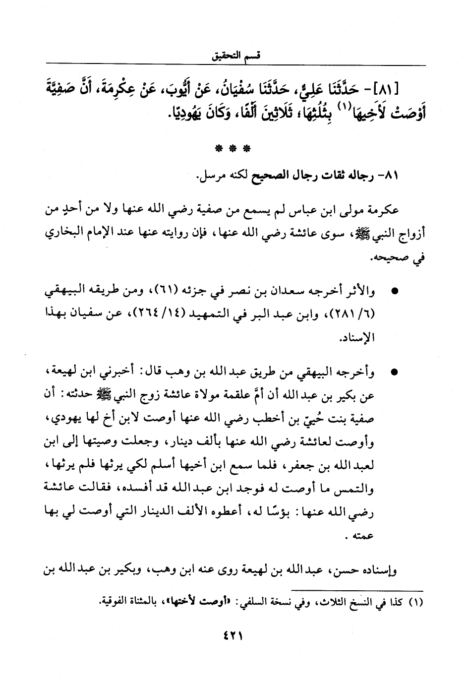 81 - حدثنا علي، حدثنا سفيان، عن أيوب، عن عكرمة، أن صفية أوصت لأخيها بثلثها؛ ثلاثين ألفا، وكان يهوديا.