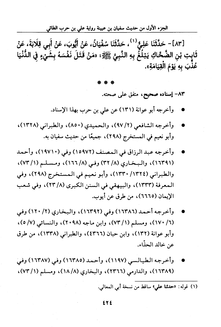 83 - حدثنا علي، حدثنا سفيان، عن أيوب، عن أبي قلابة، عن ثابت بن الضحاك يبلغ به النبي صلى الله عليه وسلم: ((من قتل نفسه بشيء في الدنيا عذب به يوم القيامة)).