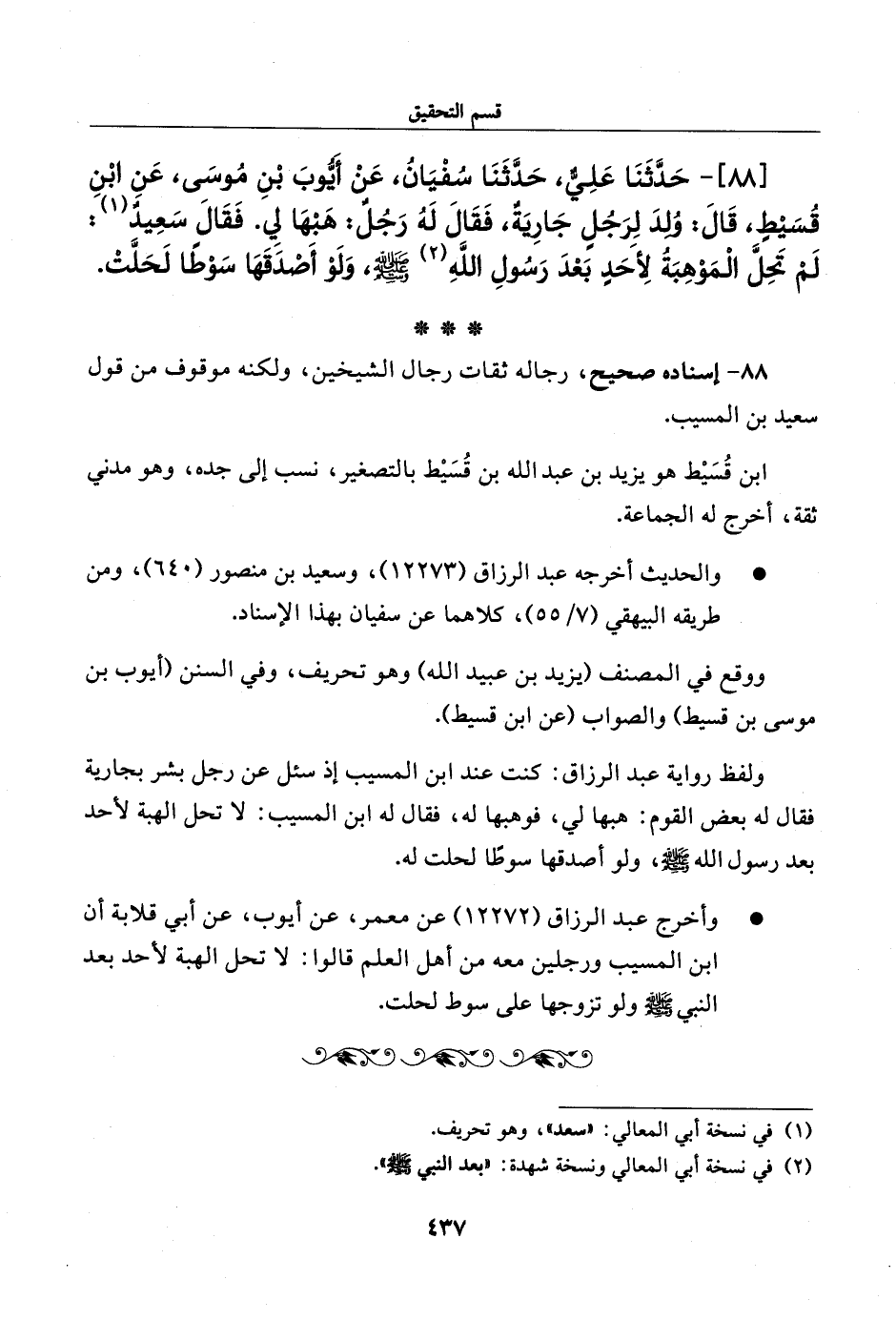 88 - حدثنا علي، حدثنا سفيان، عن أيوب بن موسى، عن ابن قسيط، قال: ولد لرجل جارية، فقال له رجل: هبها لي. فقال سعيد: لم تحل الموهبة لأحد بعد رسول الله صلى الله عليه وسلم، ولو أصدقها سوطا لحلت.