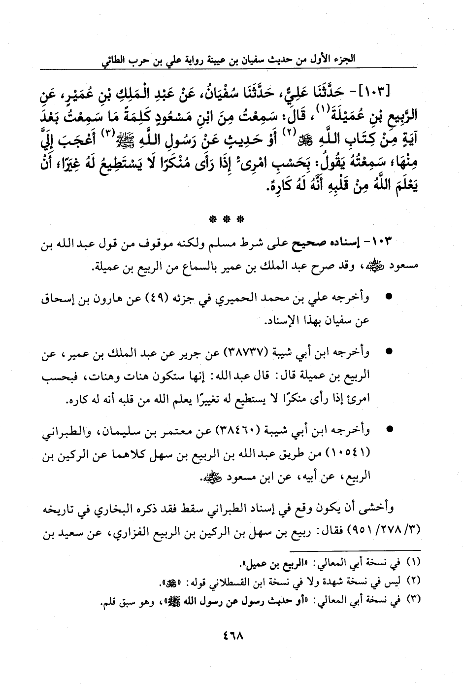 103 - حدثنا علي، حدثنا سفيان، عن عبد الملك بن عمير، عن الربيع بن عميلة، قال: سمعت من ابن مسعود كلمة ما سمعت بعد آية من كتاب الله عز وجل أو حديث عن رسول الله صلى الله عليه وسلم أعجب إلي منها؛ سمعته يقول: بحسب امرئ إذا رأى منكرا لا يستطيع له غيرا؛ أن يعلم الله من قلبه أنه له كاره.