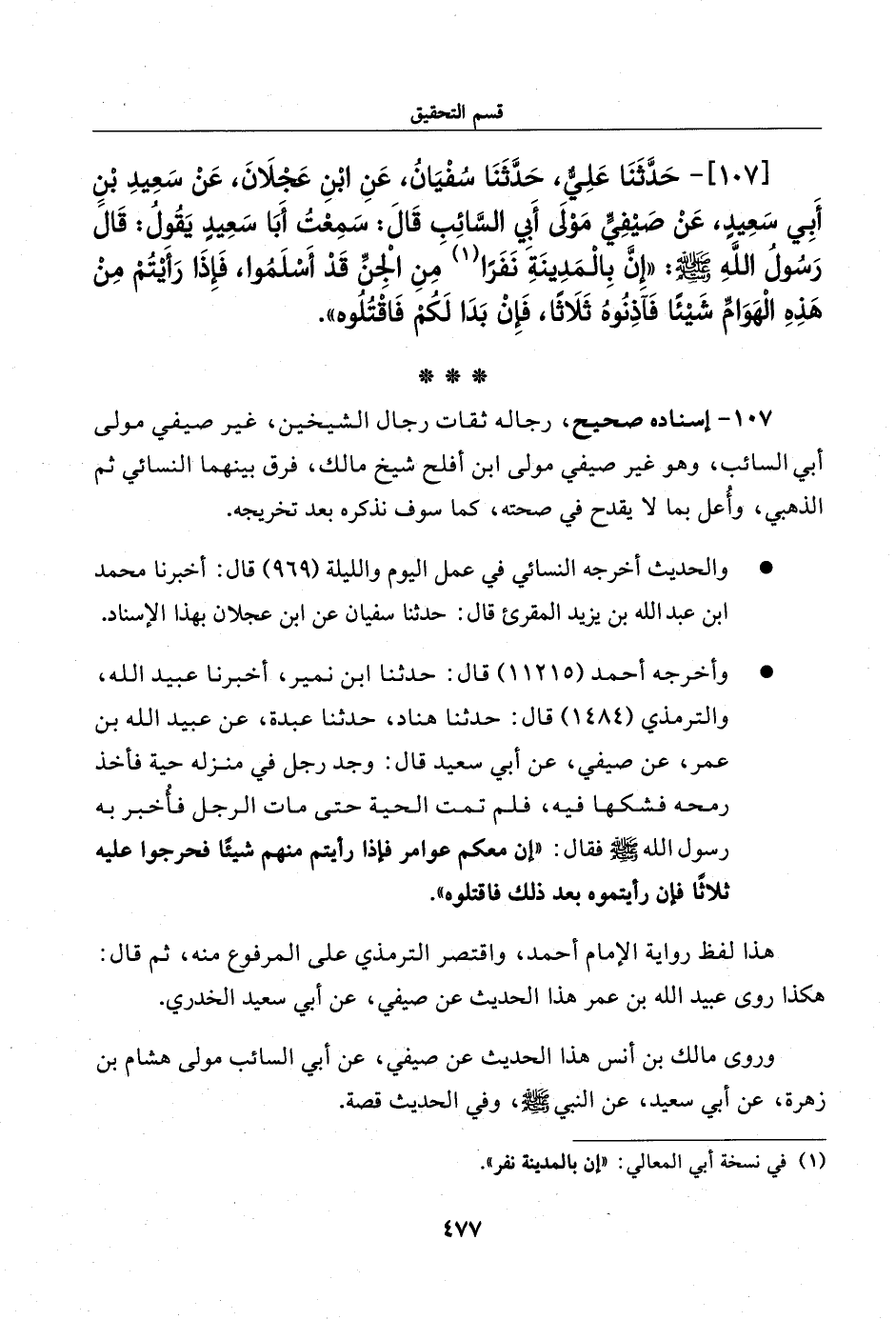107 - حدثنا علي، حدثنا سفيان، عن ابن عجلان، عن سعيد بن أبي سعيد، عن صيفي مولى أبي السائب قال: سمعت أبا سعيد يقول: قال رسول الله صلى الله عليه وسلم: ((إن بالمدينة نفرا من الجن قد أسلموا، فإذا رأيتم من هذه الهوام شيئا فآذنوه ثلاثا، فإن بدا لكم فاقتلوه)).