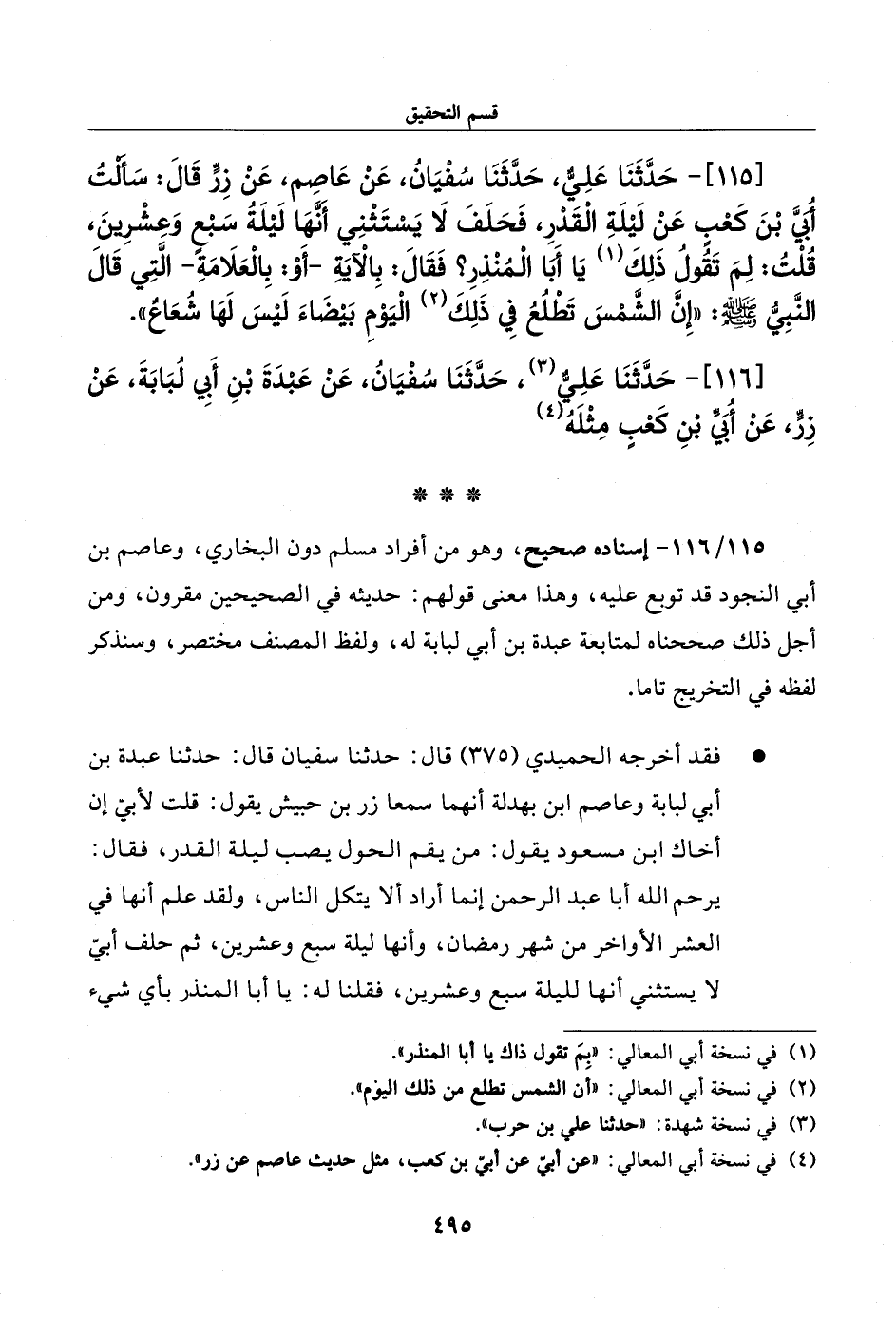 115 - حدثنا علي، حدثنا سفيان، عن عاصم، عن زر قال: سألت أبي بن كعب عن ليلة القدر، فحلف لا يستثني أنها ليلة سبع وعشرين، قلت: لم تقول ذلك يا أبا المنذر؟ فقال: بالآية -أو: بالعلامة- التي قال النبي صلى الله عليه وسلم: ((إن الشمس تطلع في ذلك اليوم بيضاء ليس لها شعاع)).