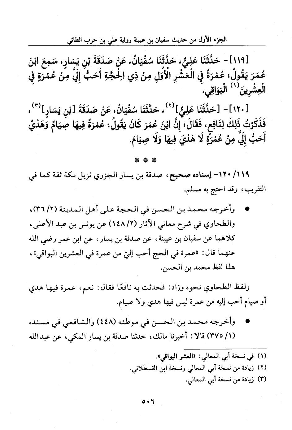 119 - حدثنا علي، حدثنا سفيان، عن صدقة بن يسار، سمع ابن عمر يقول: عمرة في العشر الأول من ذي الحجة أحب إلي من عمرة في العشرين البواقي.