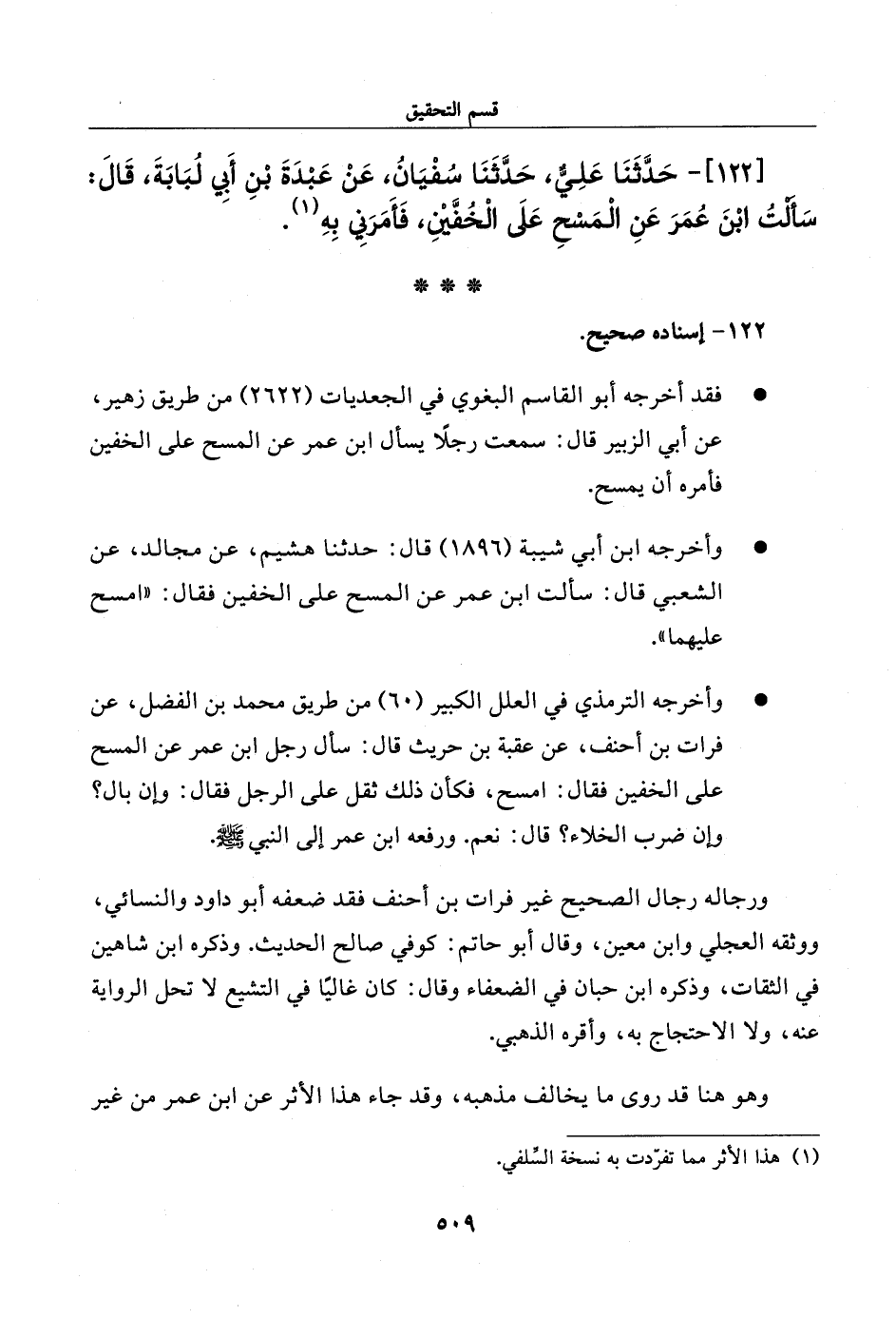 122 - حدثنا علي، حدثنا سفيان، عن عبدة بن أبي لبابة، قال: سألت ابن عمر عن المسح على الخفين، فأمرني به.
