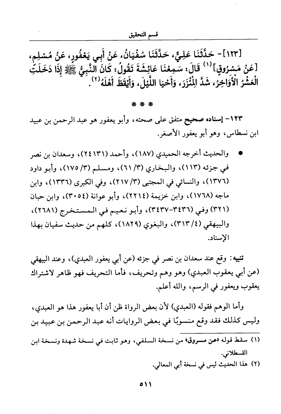 123 - حدثنا علي، حدثنا سفيان، عن أبي يعفور، عن مسلم، [عن مسروق] قال: سمعنا عائشة تقول: كان النبي صلى الله عليه إذا دخلت العشر الأواخر، شد المئزر، وأحيا الليل، وأيقظ أهله.
