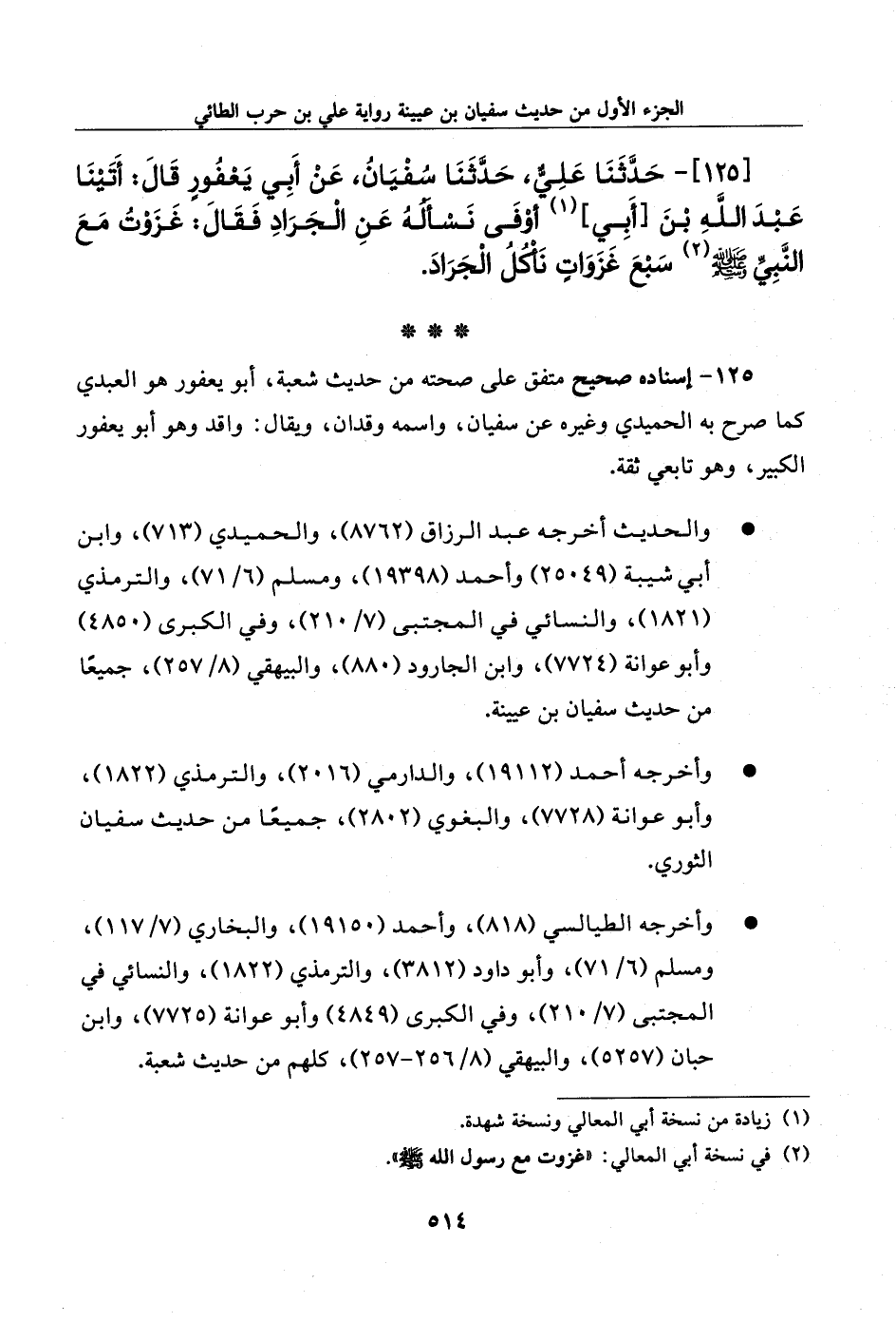 125 - حدثنا علي، حدثنا سفيان، عن أبي يعفور قال: أتينا عبد الله بن [أبي] أوفى نسأله عن الجراد فقال: غزوت مع النبي صلى الله عليه وسلم سبع غزوات نأكل الجراد.