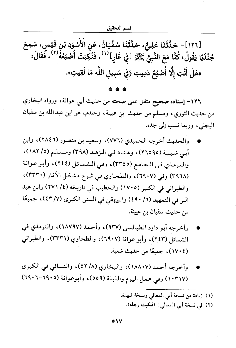 126 - حدثنا علي، حدثنا سفيان، عن الأسود بن قيس، سمع جندبا يقول: كنا مع النبي صلى الله عليه وسلم [في غار]، فنكبت أصبعه، فقال: ((هل أنت إلا أصبع دميت وفي سبيل الله ما لقيت)).